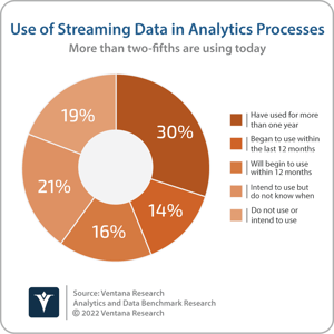 I previously explained that existing investment in data warehouses and data lakes does not need to be abandoned to embrace data mesh. These analytic data platforms can serve a role as data repositories used by individual business domains to store and process domain-oriented data in a data mesh. Investment in new technology may be required to facilitate the sharing, discovery and self-service access to those data products. Many organizations may have already taken the first steps towards embracing suitable technology without necessarily adopting the data mesh approach or terminology. Introducing the concept of the data mesh, Zhamak Dehghani, principal technology consultant at Thoughtworks, stated that “business facts are best presented as business domain events.” Many organizations have already adopted streaming data and event technologies, such as the open source Apache Kafka project, to facilitate and manage the flow of data between applications, systems and business domains. More than two-fifths (44%) of participants to Ventana Research’s Analytics and Data Benchmark Research use streaming data in analytics processes today, and 37% plan to do so. One of the concepts of Kafka, as well as other streaming technologies such as Apache Pulsar, is the publication of events and messages as topics to which consumers subscribe. At the recent Kafka Summit, I spoke to multiple organizations that are already using streaming data and are in the process of adopting data mesh, utilizing the ability to publish and subscribe to topics as a technological enabler for data-as-a-product.
