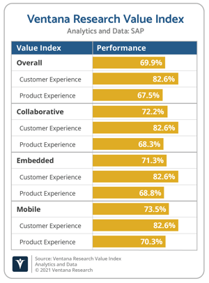 In all of our Value Indexes, we utilize a structured research methodology that includes evaluation categories designed to reflect real-world criteria incorporated in a request for proposal and vendor selection process for analytics and business intelligence. We evaluated SAP and 17 other vendors in seven categories: five relevant to the product and experience – Adaptability, Capability, Manageability, Reliability and Usability – and two related to the customer experience – Total Cost of Ownership/Return on Investment and Vendor Validation. To arrive at the Value Index rating for a given vendor, we weighted each category to reflect its relative importance in an RFP process, with the weightings based on our experience and on data derived from our Benchmark Research on Analytics and Business Intelligence. SAP performance rating in the Value Index is overall at 69.9% and for customer experience is 82.6% and product experience is 67.5%.