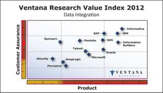 Companies compared in the 2012 Value Index for Data Integration include: Attunityfollow, IBM, Informatica, Information Builders, Microsoft, Oracle, Pentaho, Pervasive, SAP, SAS, SnapLogic, Syncsort, and Talend.